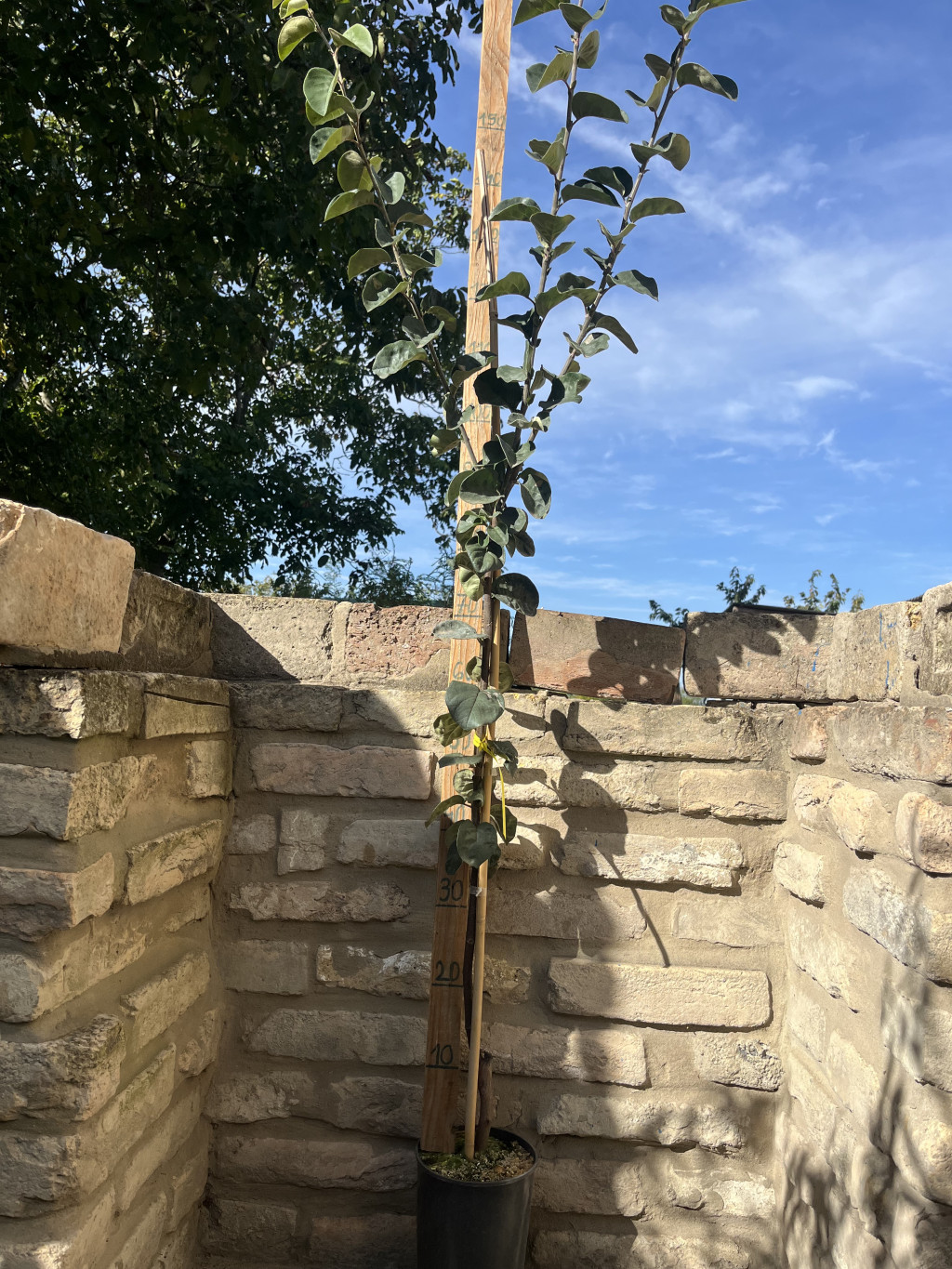 Die Konstantinopel- Quitte hat große, ovale Früchte, die 7-12 cm lang sind. Ihre Schale ist glatt, gelb oder goldfarben, manchmal mit orangenen Schattierungen. Das Fruchtfleisch ist zäh, aber äußerst aromatisch und hat einen süß-sauren Geschmack, der beim Kochen oder Dämpfen besonders zur Geltung kommt. Die Fruchtreife erfolgt normalerweise im mittleren bis späten Herbst, typischerweise zwischen September und November, was es ermöglicht, die Quitten auch in den kühleren Monaten zu genießen.