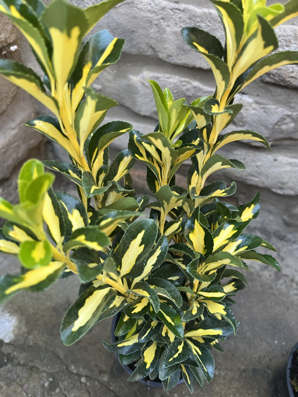 - **Blatt:** Hat kleine, ovale, dunkelgrüne Blätter mit goldgelben Rändern, was der Pflanze einen besonderen dekorativen Effekt verleiht.