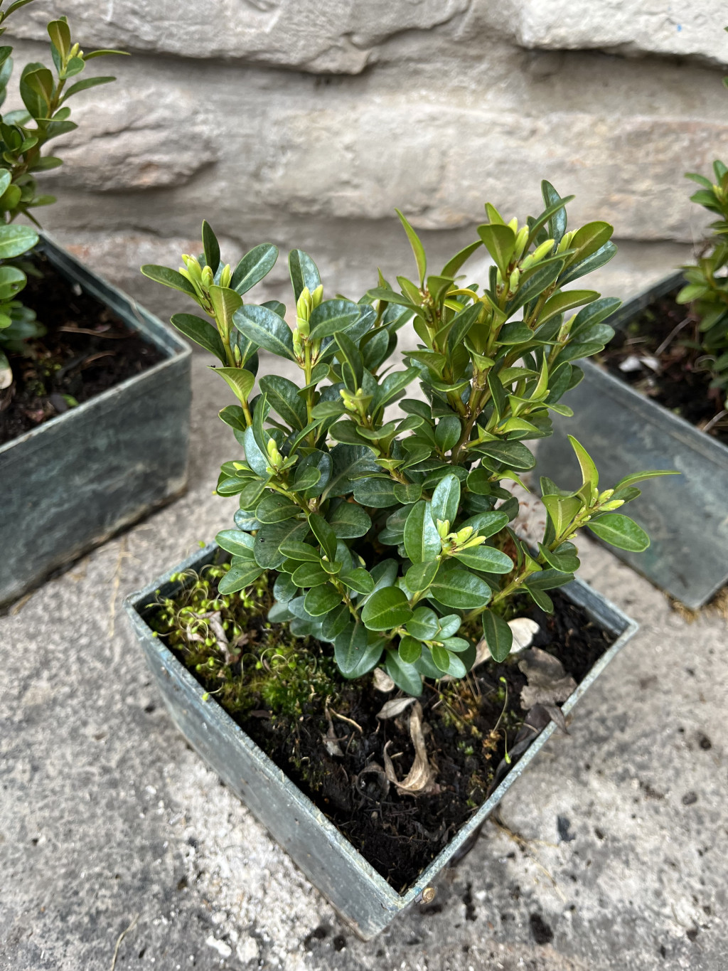 Buxus sempervirens ist ein langsam wachsender, immergrüner Strauch, der Höhen von 1 bis 6 Metern erreichen kann und eine Breite von bis zu 1 bis 2 Metern haben kann, abhängig von der Pflege und dem Schnitt. Die Blätter sind klein, glänzend grün, elliptisch geformt und dicht an den Zweigen angeordnet, was dem Pflanze ein formelles Erscheinungsbild verleiht. Die Blätter bleiben das ganze Jahr über erhalten und bieten einen konstanten grünen Hintergrund. Die Blüten sind klein und gelblich-grün und erscheinen normalerweise im Frühjahr, sind jedoch weniger auffällig als die Blüten anderer Pflanzen, sodass die Hauptattraktivität des Buchsbaums in seinem Laub liegt.