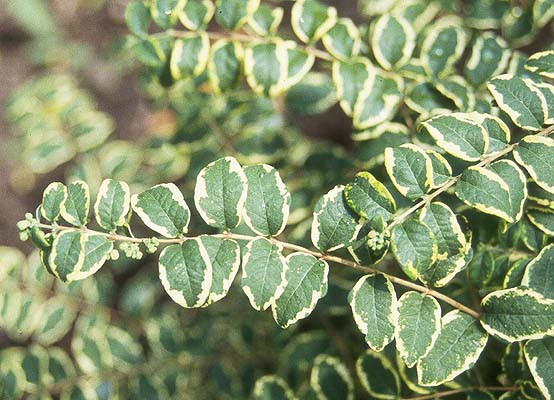 - **Laub**: Die Blätter sind oval, grün und haben einen schönen, cremeweißen oder gelben Rand, was der Pflanze einen besonderen dekorativen Wert verleiht.