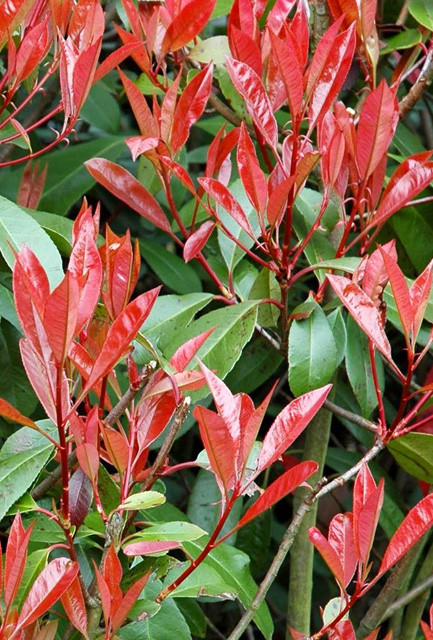 1. **Erscheinungsbild**: Dieser Strauch wächst normalerweise auf eine Höhe von 1-2 Metern, kann unter geeigneten Bedingungen jedoch bis zu 3 Meter hoch werden. Die 'Red Robin' hat ein dichtes, buschiges Wachstum und nimmt eine runde Form an, die sie ideal für Hecken und Ziergärten macht.